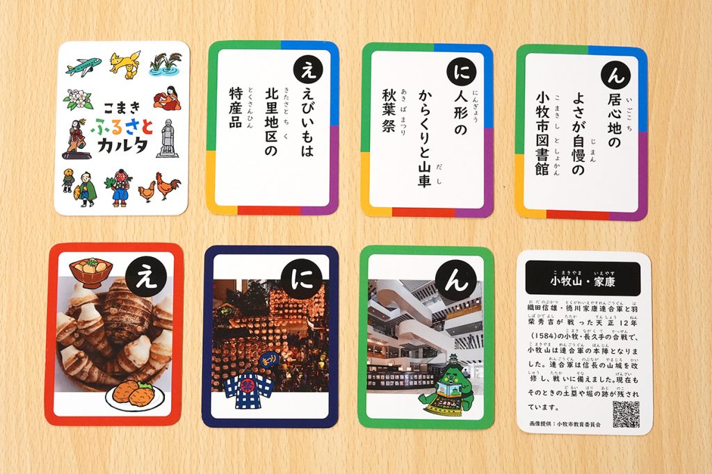 「こまきふるさとカルタ」は、歴史や文化財、「食」や昔話など、さまざまなテーマからなり、「ふるさと小牧」を知る・学ぶための入口としてぴったりの図書館オリジナルのカルタです。
