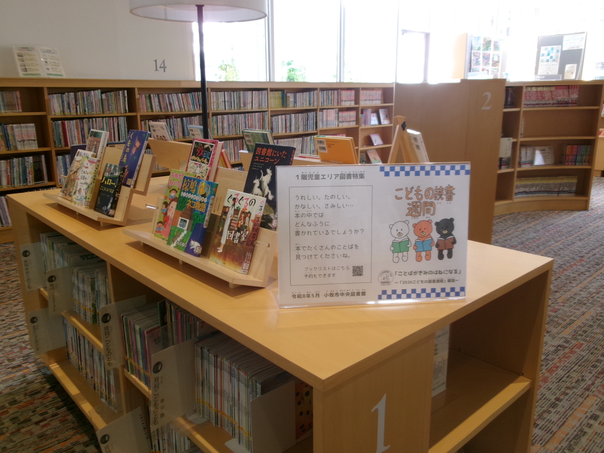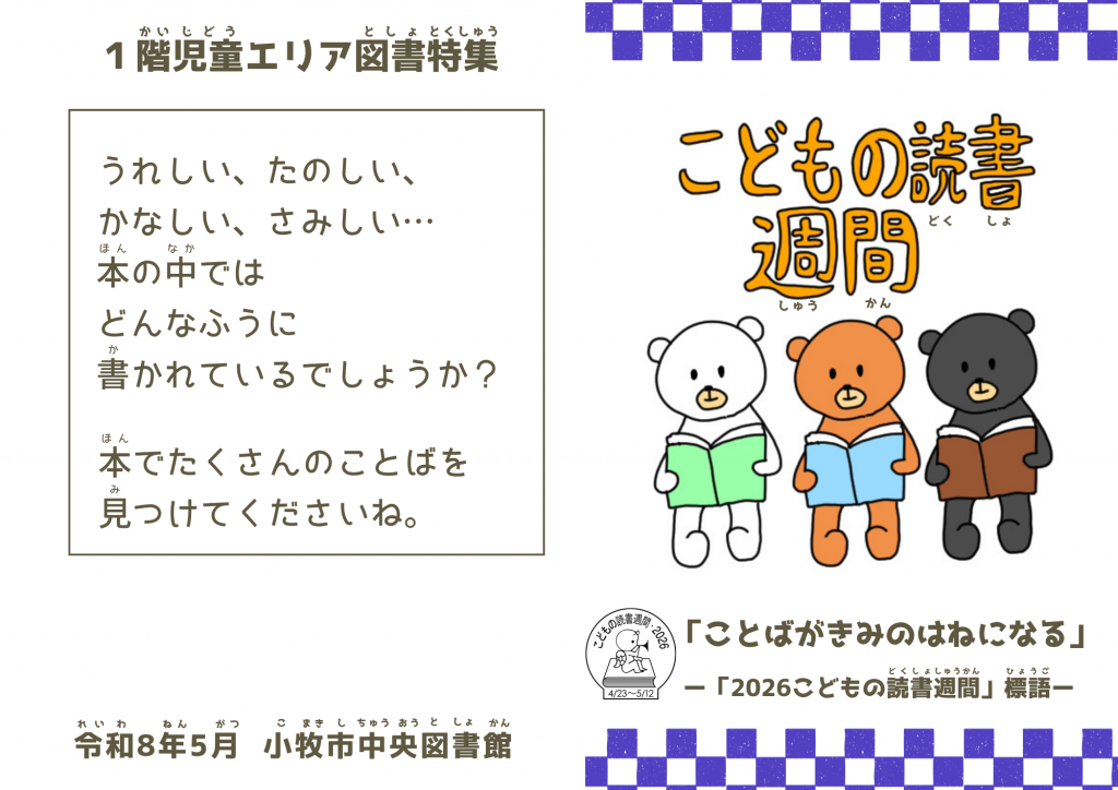1階児童エリア図書特集 令和8年(2026)こどもの読書週間「ことばがきみのはねになる」